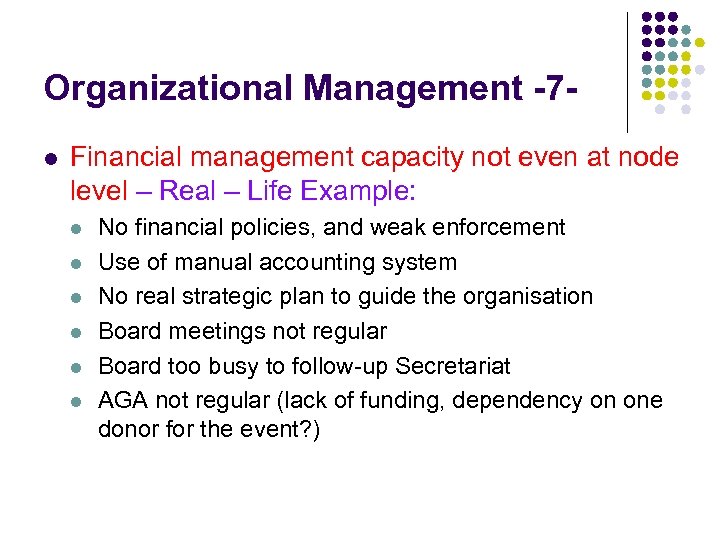 Organizational Management -7 l Financial management capacity not even at node level – Real – Life Example: l l l No financial policies, and weak enforcement Use of manual accounting system No real strategic plan to guide the organisation Board meetings not regular Board too busy to follow-up Secretariat AGA not regular (lack of funding, dependency on one donor for the event? )