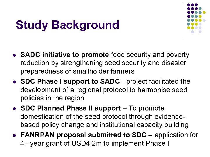 Study Background l l SADC initiative to promote food security and poverty reduction by strengthening seed security and disaster preparedness of smallholder farmers SDC Phase I support to SADC - project facilitated the development of a regional protocol to harmonise seed policies in the region SDC Planned Phase II support – To promote domestication of the seed protocol through evidencebased policy change and institutional capacity building FANRPAN proposal submitted to SDC – application for 4 –year grant of USD 4. 2 m to implement Phase II