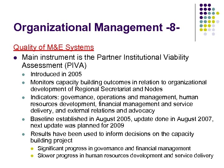 Organizational Management -8 Quality of M&E Systems l Main instrument is the Partner Institutional Viability Assessment (PIVA) l l l Introduced in 2005 Monitors capacity building outcomes in relation to organizational development of Regional Secretariat and Nodes Indicators: governance, operations and management, human resources development, financial management and service delivery, and external relations and advocacy Baseline established in August 2005, update done in August 2007, next update was planned for 2009 Results have been used to inform decisions on the capacity building project l l Significant progress in governance and financial management Slower progress in human resources development and service delivery