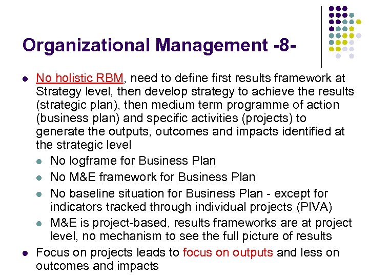 Organizational Management -8 l l No holistic RBM, need to define first results framework at Strategy level, then develop strategy to achieve the results (strategic plan), then medium term programme of action (business plan) and specific activities (projects) to generate the outputs, outcomes and impacts identified at the strategic level l No logframe for Business Plan l No M&E framework for Business Plan l No baseline situation for Business Plan - except for indicators tracked through individual projects (PIVA) l M&E is project-based, results frameworks are at project level, no mechanism to see the full picture of results Focus on projects leads to focus on outputs and less on outcomes and impacts