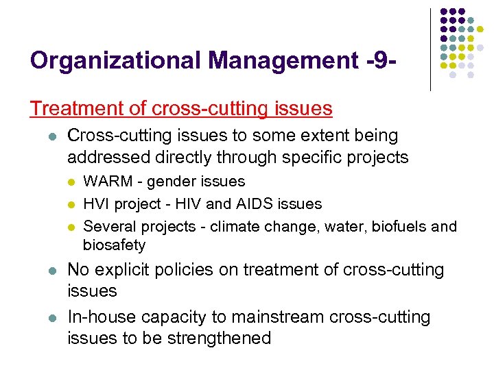 Organizational Management -9 Treatment of cross-cutting issues l Cross-cutting issues to some extent being addressed directly through specific projects l l l WARM - gender issues HVI project - HIV and AIDS issues Several projects - climate change, water, biofuels and biosafety No explicit policies on treatment of cross-cutting issues In-house capacity to mainstream cross-cutting issues to be strengthened
