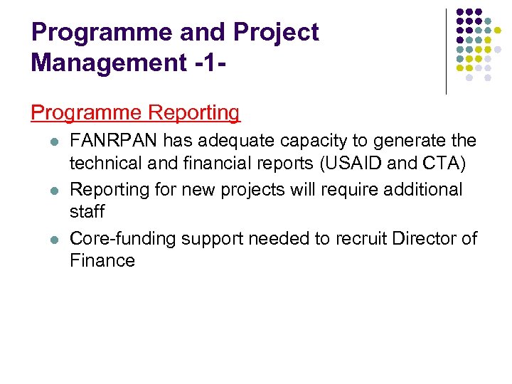 Programme and Project Management -1 Programme Reporting l l l FANRPAN has adequate capacity to generate the technical and financial reports (USAID and CTA) Reporting for new projects will require additional staff Core-funding support needed to recruit Director of Finance