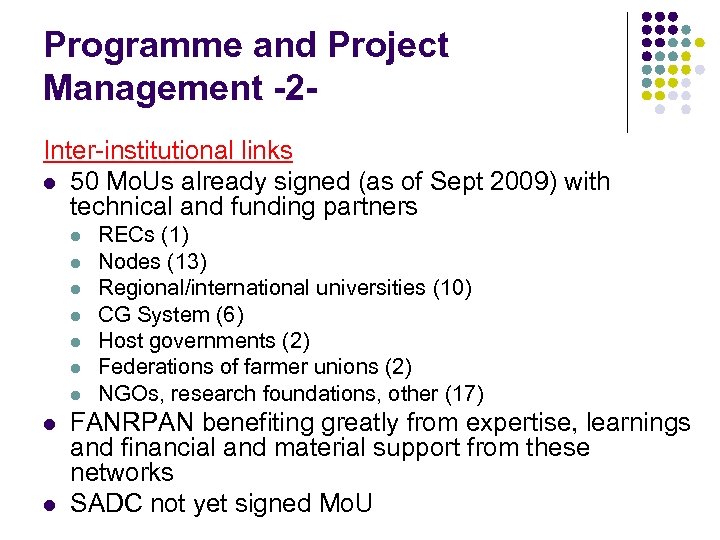 Programme and Project Management -2 Inter-institutional links l 50 Mo. Us already signed (as of Sept 2009) with technical and funding partners l l l l l RECs (1) Nodes (13) Regional/international universities (10) CG System (6) Host governments (2) Federations of farmer unions (2) NGOs, research foundations, other (17) FANRPAN benefiting greatly from expertise, learnings and financial and material support from these networks SADC not yet signed Mo. U