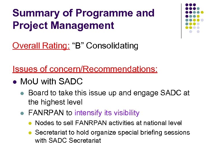 Summary of Programme and Project Management Overall Rating: “B” Consolidating Issues of concern/Recommendations: l Mo. U with SADC l l Board to take this issue up and engage SADC at the highest level FANRPAN to intensify its visibility l l Nodes to sell FANRPAN activities at national level Secretariat to hold organize special briefing sessions with SADC Secretariat
