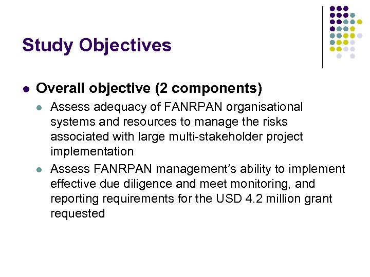 Study Objectives l Overall objective (2 components) l l Assess adequacy of FANRPAN organisational systems and resources to manage the risks associated with large multi-stakeholder project implementation Assess FANRPAN management’s ability to implement effective due diligence and meet monitoring, and reporting requirements for the USD 4. 2 million grant requested