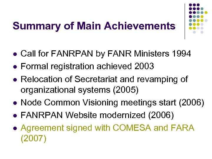 Summary of Main Achievements l l l Call for FANRPAN by FANR Ministers 1994 Formal registration achieved 2003 Relocation of Secretariat and revamping of organizational systems (2005) Node Common Visioning meetings start (2006) FANRPAN Website modernized (2006) Agreement signed with COMESA and FARA (2007)