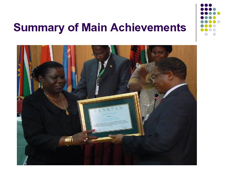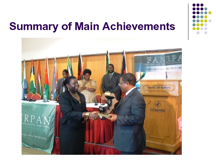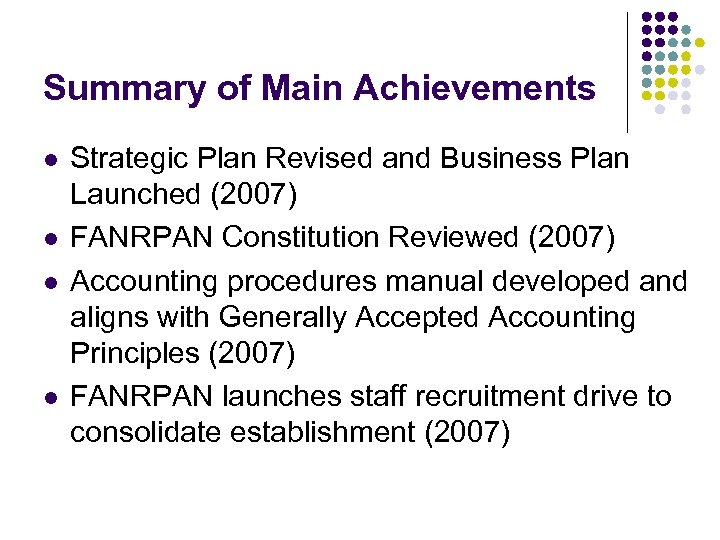 Summary of Main Achievements l l Strategic Plan Revised and Business Plan Launched (2007) FANRPAN Constitution Reviewed (2007) Accounting procedures manual developed and aligns with Generally Accepted Accounting Principles (2007) FANRPAN launches staff recruitment drive to consolidate establishment (2007)