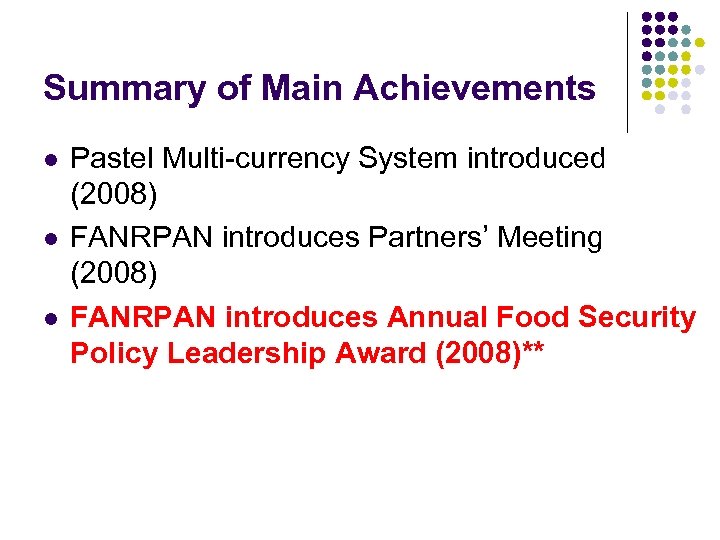 Summary of Main Achievements l l l Pastel Multi-currency System introduced (2008) FANRPAN introduces Partners’ Meeting (2008) FANRPAN introduces Annual Food Security Policy Leadership Award (2008)**