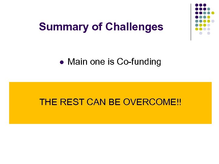 Summary of Challenges l Main one is Co-funding THE REST CAN BE OVERCOME!!