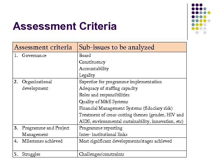 Assessment Criteria Assessment criteria Sub-issues to be analyzed 1. Governance 3. Programme and Project Management 4. Milestones achieved Board Constituency Accountability Legality Expertise for programme implementation Adequacy of staffing capacity Roles and responsibilities Quality of M&E Systems Financial Management Systems (fiduciary risk) Treatment of cross-cutting themes (gender, HIV and AIDS, environmental sustainability, innovation, etc) Programme reporting Inter- institutional links Most significant developments/stages achieved 5. Struggles Challenges/constraints 2. Organizational development