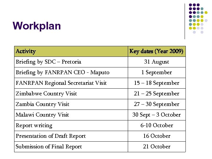 Workplan Activity Briefing by SDC – Pretoria Key dates (Year 2009) 31 August Briefing by FANRPAN CEO - Maputo 1 September FANRPAN Regional Secretariat Visit 15 – 18 September Zimbabwe Country Visit 21 – 25 September Zambia Country Visit 27 – 30 September Malawi Country Visit 30 Sept – 3 October Report writing 6 -10 October Presentation of Draft Report 16 October Submission of Final Report 21 October