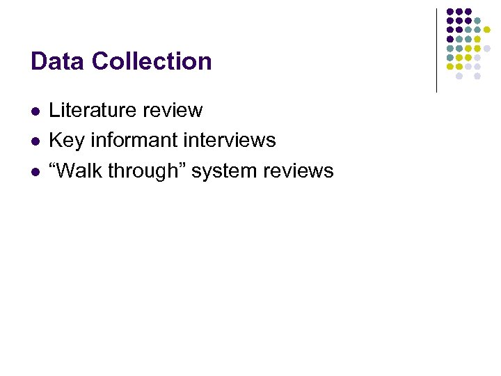 Data Collection l l l Literature review Key informant interviews “Walk through” system reviews