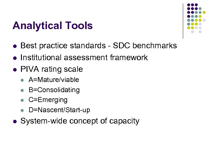 Analytical Tools l l l Best practice standards - SDC benchmarks Institutional assessment framework PIVA rating scale l l l A=Mature/viable B=Consolidating C=Emerging D=Nascent/Start-up System-wide concept of capacity