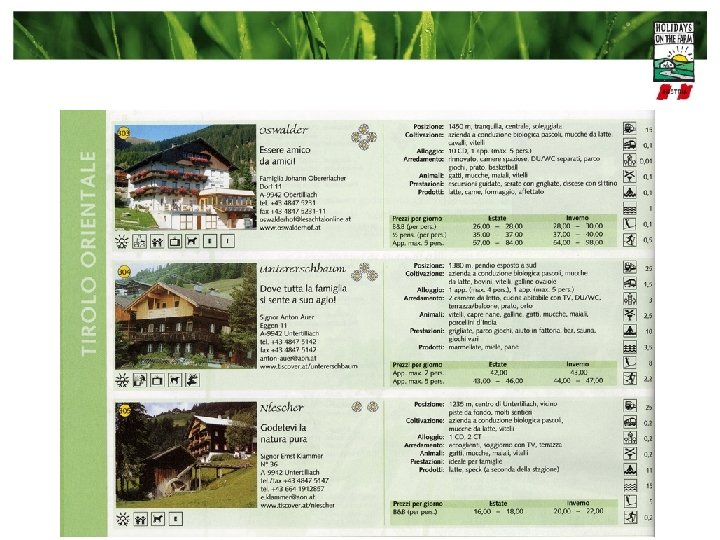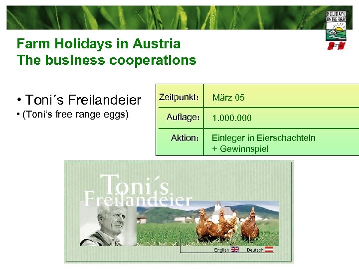 Farm Holidays in Austria The business cooperations • Toni´s Freilandeier • (Toni‘s free range eggs) Zeitpunkt: Auflage: Aktion: März 05 1. 000 Einleger in Eierschachteln + Gewinnspiel