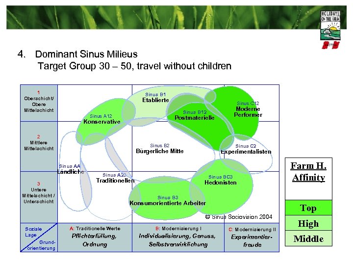 4. Dominant Sinus Milieus Target Group 30 – 50, travel without children 1 Oberschicht/ Obere Mittelschicht Sinus B 1 Etablierte Sinus C 12 Moderne Performer Sinus B 12 Sinus A 12 Postmaterielle Konservative 2 Mittlere Mittelschicht Sinus B 2 Sinus C 2 Bürgerliche Mitte Experimentalisten Sinus AA Ländliche 3 Untere Mittelschicht / Unterschicht Sinus A 23 Sinus BC 3 Traditionellen Hedonisten Sinus B 3 Konsumorientierte Arbeiter Top © Sinus Sociovision 2004 Soziale Lage Grundorientierung Farm H. Affinity A: Traditionelle Werte B: Modernisierung I C: Modernisierung II Pflichterfüllung, Ordnung Individualisierung, Genuss, Selbstverwirklichung Experimentierfreude High Middle