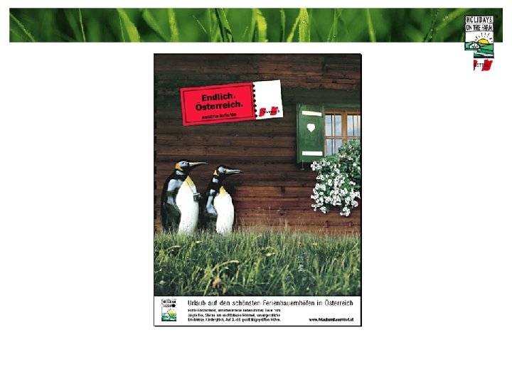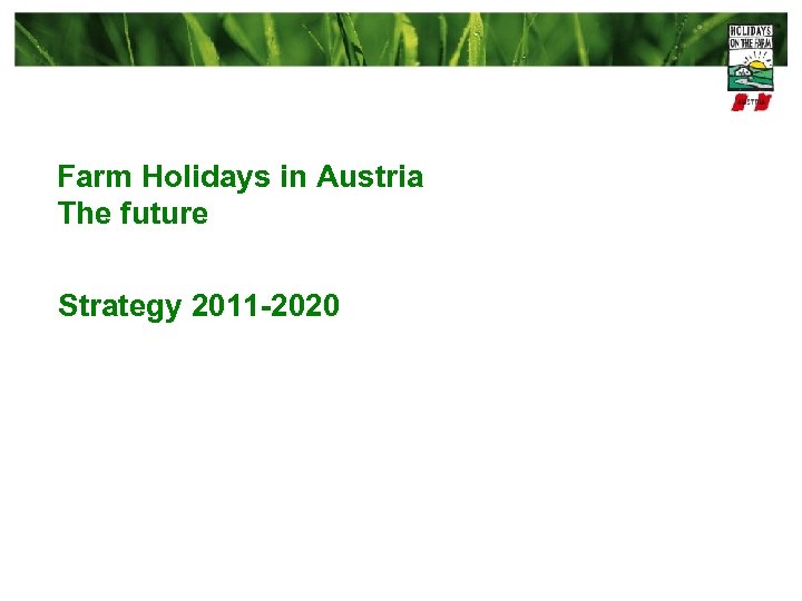 Branding for Farm holidays – what can the farm holidays association achieve? (as cooperation plattform of the 8 provincial associations and their 3. 000 member farms) * To realize ONE branding-strategy for Austria and thus …. . . optimizing the use of the (limited) marketing resources. . . making Farm Holidays „noticeable at the market“. . . steering the marketing activities * „prepare the ground“ für marketing activities on enterprise level * optimize the F. H. -presence at the tourism market (esp. on internet) * creating image – „Farm holidays are in trend!“ * reaching a limited number of customers in particular