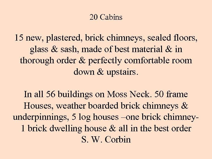 20 Cabins 15 new, plastered, brick chimneys, sealed floors, glass & sash, made of best material & in thorough order & perfectly comfortable room down & upstairs. In all 56 buildings on Moss Neck. 50 frame Houses, weather boarded brick chimneys & underpinnings, 5 log houses –one brick chimney 1 brick dwelling house & all in the best order S. W. Corbin