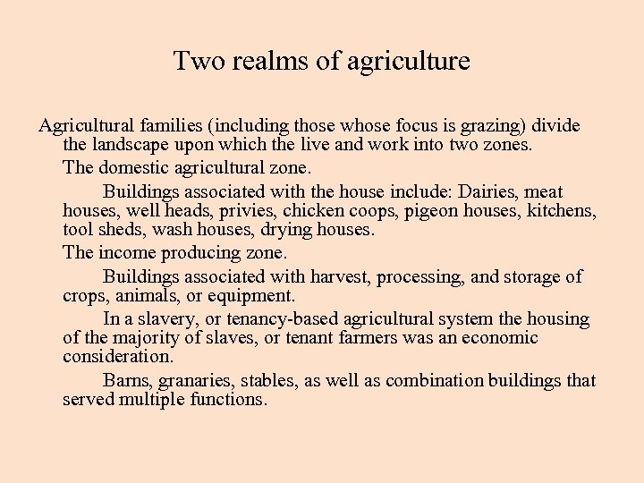 Two realms of agriculture Agricultural families (including those whose focus is grazing) divide the landscape upon which the live and work into two zones. The domestic agricultural zone. Buildings associated with the house include: Dairies, meat houses, well heads, privies, chicken coops, pigeon houses, kitchens, tool sheds, wash houses, drying houses. The income producing zone. Buildings associated with harvest, processing, and storage of crops, animals, or equipment. In a slavery, or tenancy-based agricultural system the housing of the majority of slaves, or tenant farmers was an economic consideration. Barns, granaries, stables, as well as combination buildings that served multiple functions.