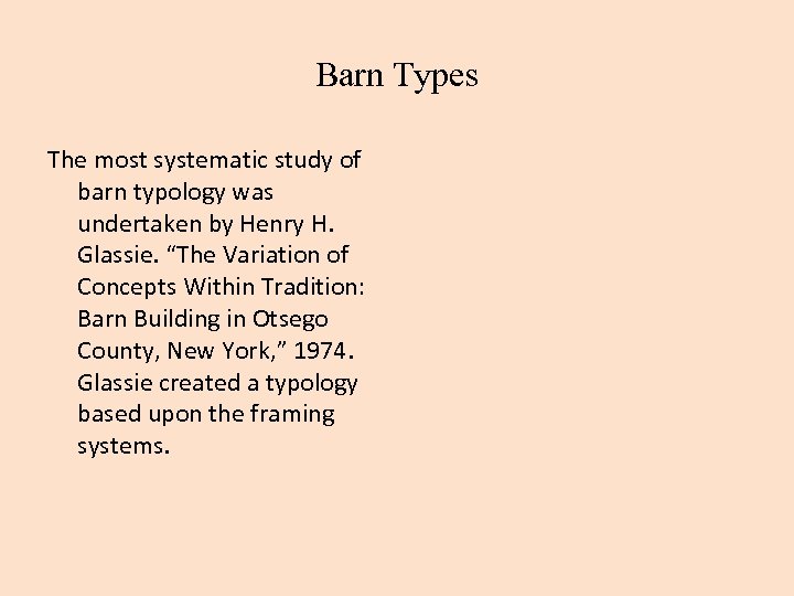 Barn Types The most systematic study of barn typology was undertaken by Henry H. Glassie. “The Variation of Concepts Within Tradition: Barn Building in Otsego County, New York, ” 1974. Glassie created a typology based upon the framing systems.