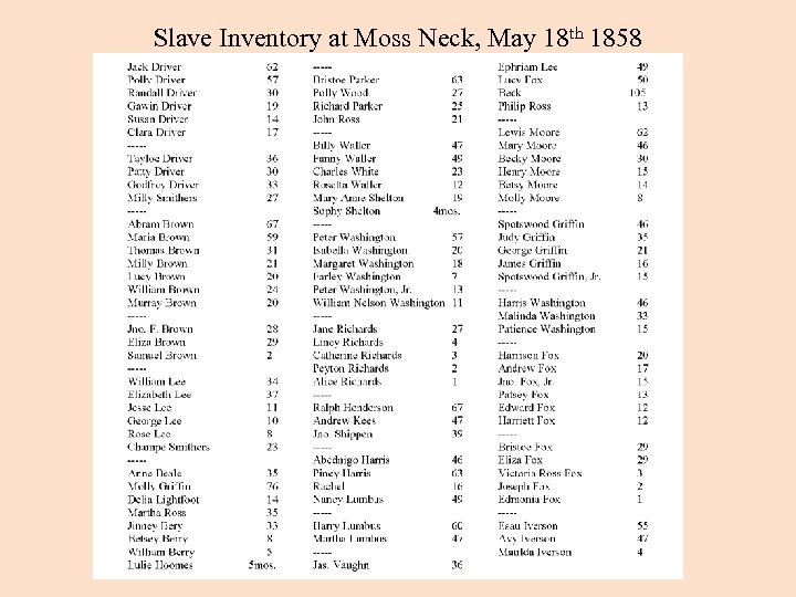 Slave Inventory at Moss Neck, May 18 th 1858