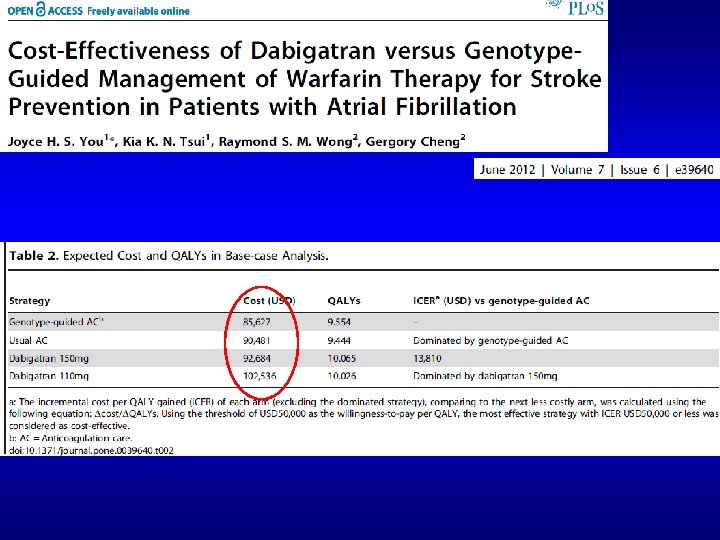 Для того, чтобы стоимость QALY при использовании фармакогенетического тестирования для дозирования варфарина был меньше 50 000 долларов США, должны соблюдаться следующие условия: • • • предотвращение более 32 % «больших» кровотечений, длительность выполнения фармакогенетического теста не более 24 часов, стоимость фармакогенетического теста менее 200 долларов США. Laufs U, Nef H, Möllmann H, Custodis F, Böhm M. Clinical trial updates and hotline sessions presented at the Scientific Session 2007 of the American Heart