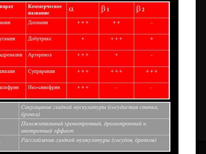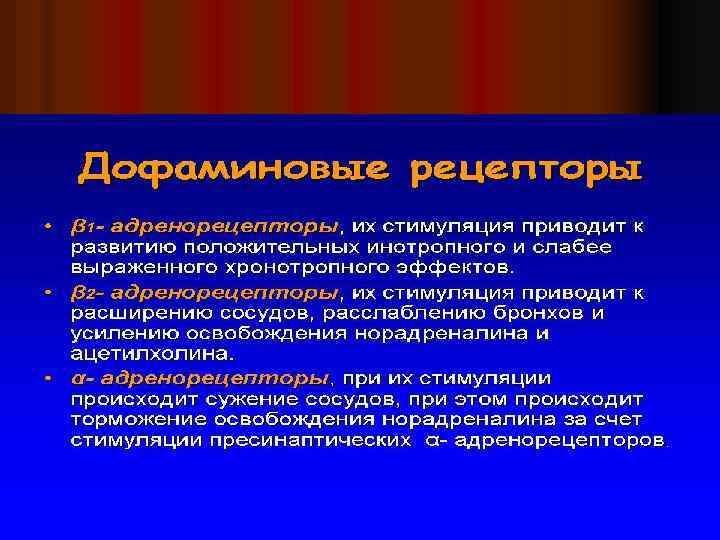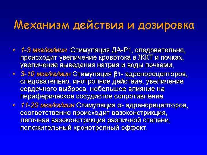 Отличия Добутамина от Дофамина l Возбуждает преимущественно ß-R l Больше увеличивает ССС, чем ЧСС l Менее эффективен l Не расширяет почечные и коронарные сосуды l Увеличивает ОПСС – при очень высоких дозах, стимулируя α-R l