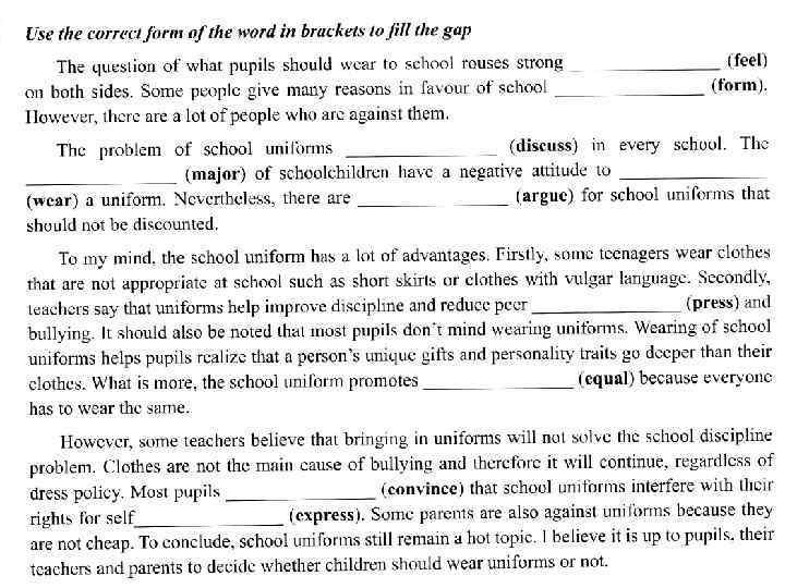 1. feelings 2. uniforms 3. is discussed 4. majority 5. wearing 6. arguments 7. pressure 8. equality 9. are convinced 10. expression