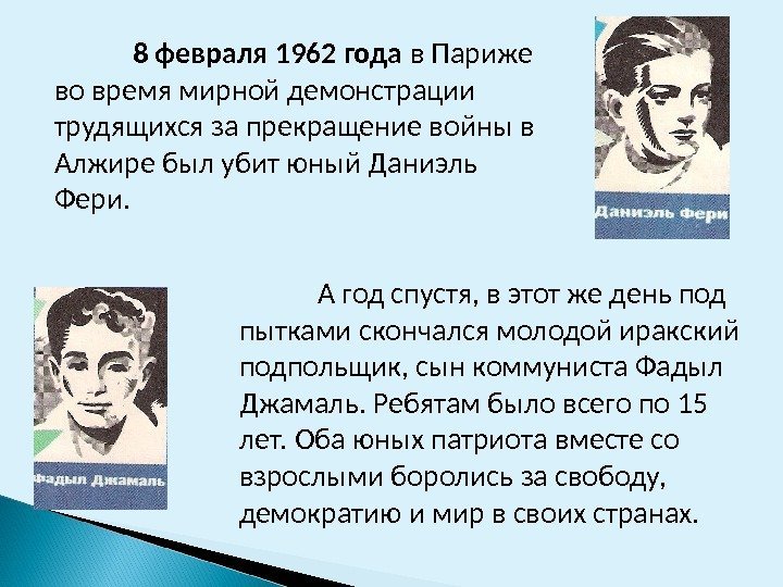 8 февраля 1962 года в Париже во время мирной демонстрации трудящихся за прекращение войны в Алжире был убит юный Даниэль Фери. А год спустя, в этот же день под пытками скончался молодой иракский подпольщик, сын коммуниста Фадыл Джамаль. Ребятам было всего по 15 лет. Оба юных патриота вместе со взрослыми боролись за свободу, демократию и мир в своих странах.