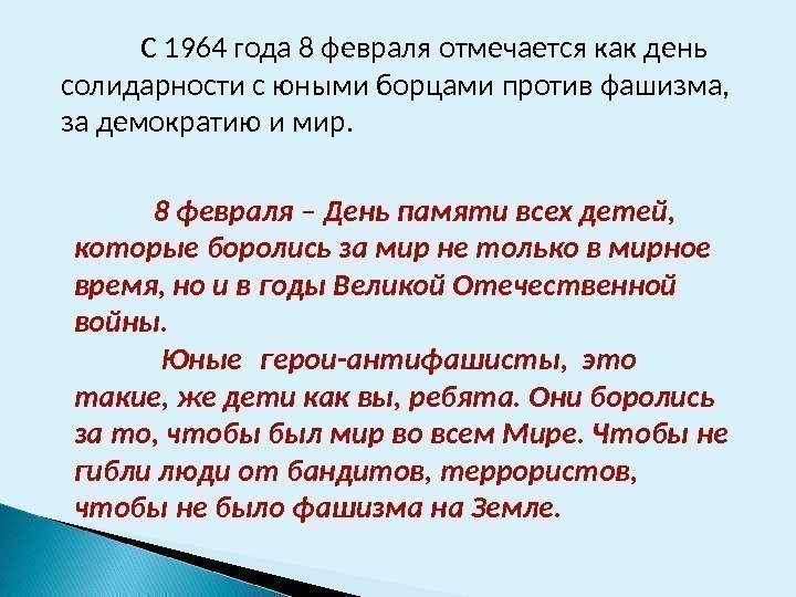 С 1964 года 8 февраля отмечается как день солидарности с юными борцами против фашизма, за демократию и мир. 8 февраля – День памяти всех детей, которые боролись за мир не только в мирное время, но и в годы Великой Отечественной войны. Юные герои-антифашисты, это такие, же дети как вы, ребята. Они боролись за то, чтобы был мир во всем Мире. Чтобы не гибли люди от бандитов, террористов, чтобы не было фашизма на Земле.