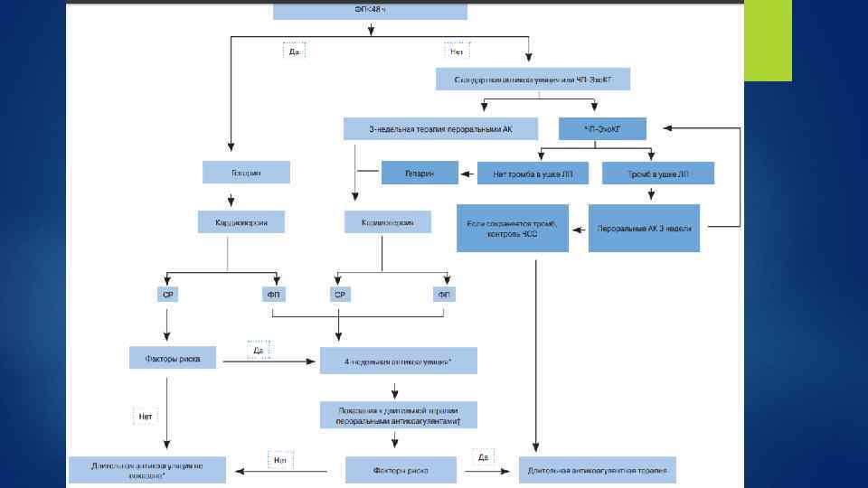 Предикторы неуспешности кардиоверсии при ФП 1. Размер ЛП более 5 см 2. Длительность ФП (более 12 мес. ) 3. Гипокалиемия 4. Тяжелая левожелудочковая недостаточность
