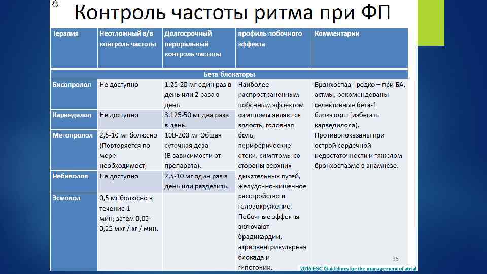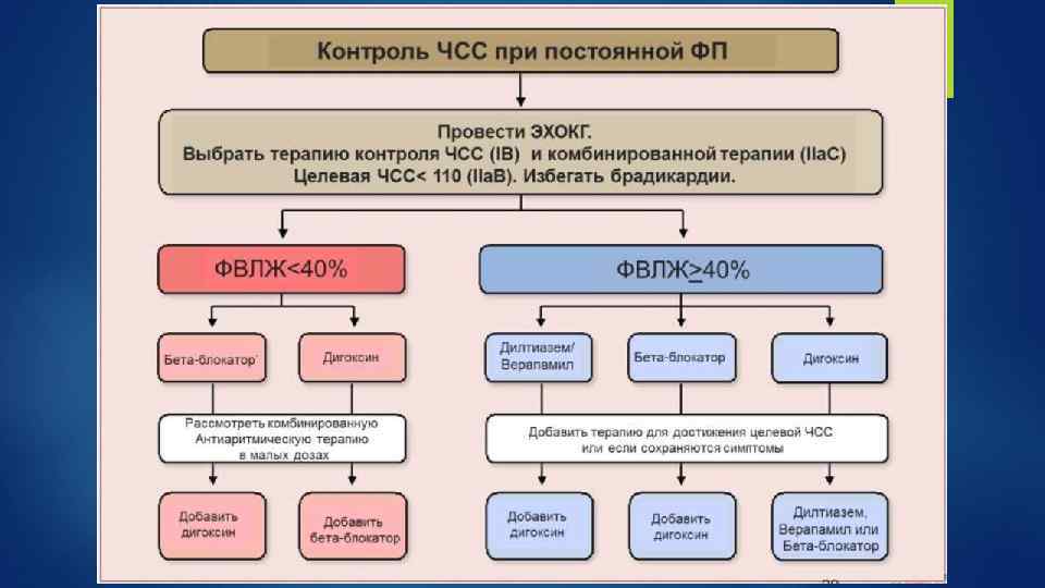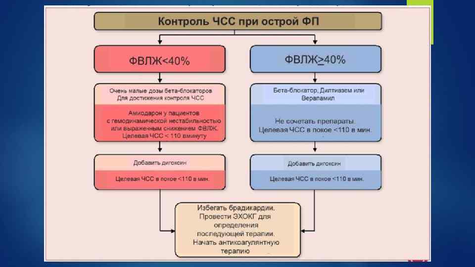 Контроль частоты сердечных сокращений Целевая ЧСС: <80 уд. /мин. в покое и <110 уд. /мин. при умеренной физической нагрузке (строгий контроль) ИЛИ <110 уд. /мин. , независимо от обстоятельств (гибкий контроль) При первичной терапии стоит придерживаться гибкого контроля При наличии симптомов сердечной недостаточности необходимо придерживаться тактики строгого контроля При отсутствии симптомов СН эти тактики равнозначны Необходимо исключить другие причины тахикардии: Инфекция Эндокринные нарушения (например, гипертиреоз) Анемия ТЭЛА