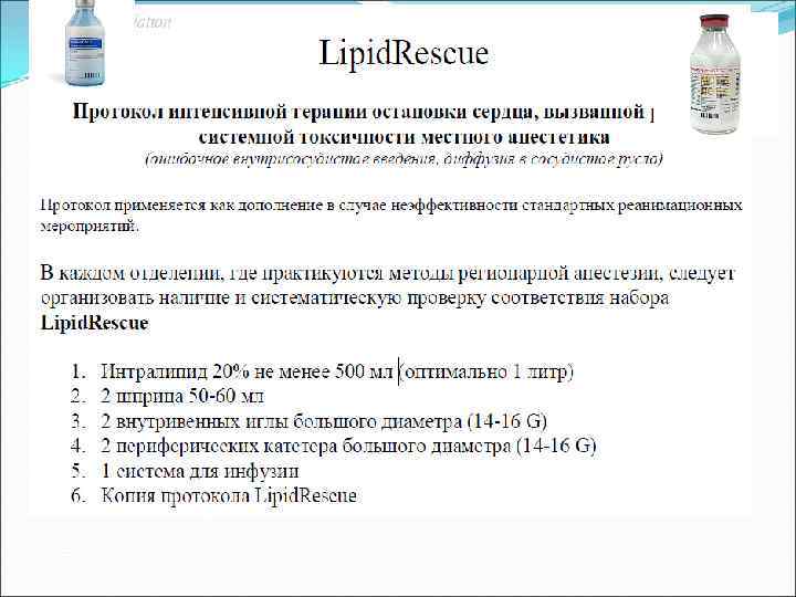 Положительные свойства Интралипида при системном токсическом действии МА могут быть суммированы следующим образом: Ø Повышает токсический порог Бупивакаина на 50% Ø «Вымывает» местный анестетик из кардиомиоцитов. Ø Устраняет вызванное МА торможение транспорта жирных кислот в кардиомиоцитах. Ø Имеются экспериментальные данные о 100% выживании животных, получивших Интралипид после введения смертельной дозы МА.