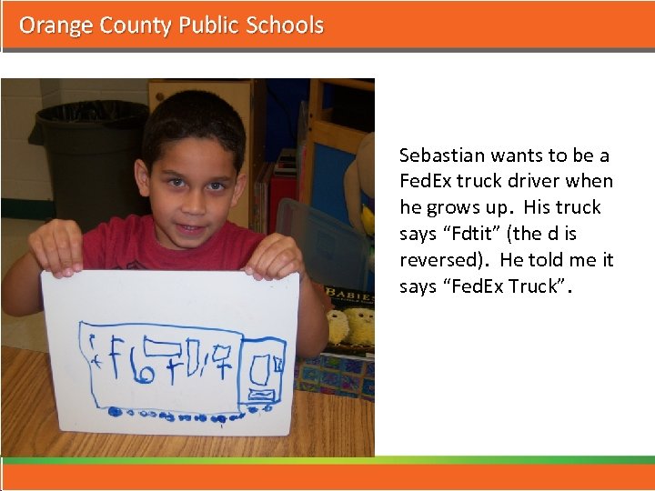 Sebastian wants to be a Fed. Ex truck driver when he grows up. His truck says “Fdtit” (the d is reversed). He told me it says “Fed. Ex Truck”.