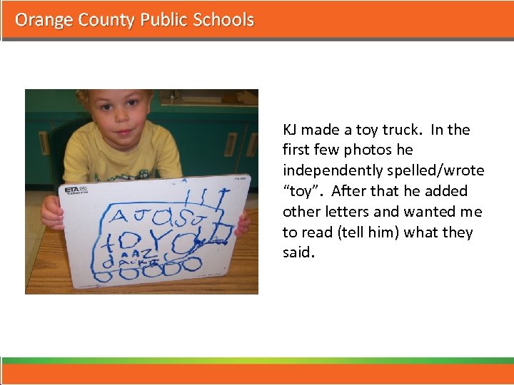 KJ made a toy truck. In the first few photos he independently spelled/wrote “toy”. After that he added other letters and wanted me to read (tell him) what they said.