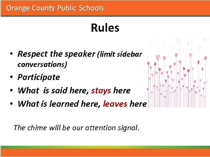 Rules • Respect the speaker (limit sidebar conversations) • Participate • What is said here, stays here • What is learned here, leaves here The chime will be our attention signal.
