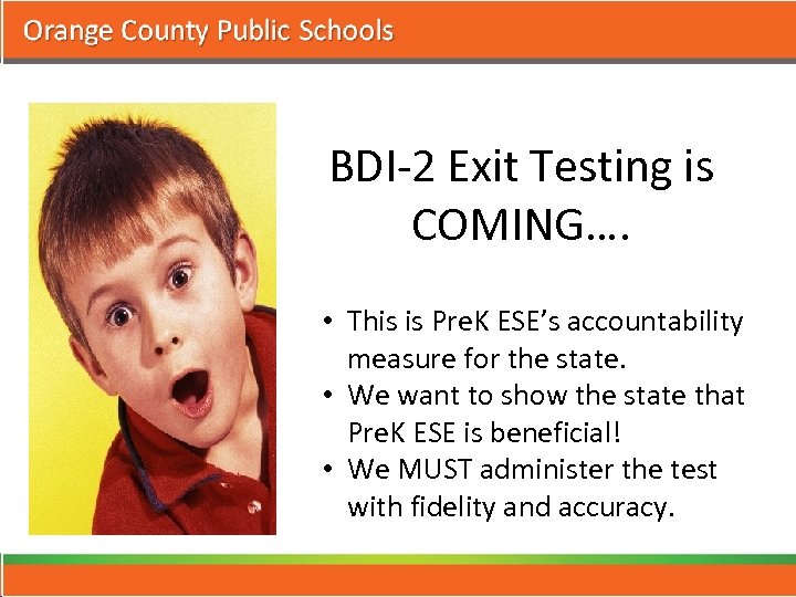 BDI-2 Exit Testing is COMING…. • This is Pre. K ESE’s accountability measure for the state. • We want to show the state that Pre. K ESE is beneficial! • We MUST administer the test with fidelity and accuracy.