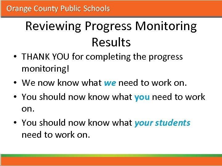 Reviewing Progress Monitoring Results • THANK YOU for completing the progress monitoring! • We now know what we need to work on. we • You should now know what you need to work you on. • You should now know what your students need to work on.