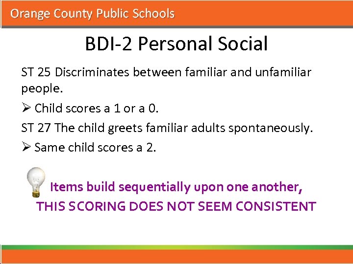 BDI-2 Personal Social ST 25 Discriminates between familiar and unfamiliar people. Ø Child scores a 1 or a 0. ST 27 The child greets familiar adults spontaneously. Ø Same child scores a 2. Items build sequentially upon one another, THIS SCORING DOES NOT SEEM CONSISTENT