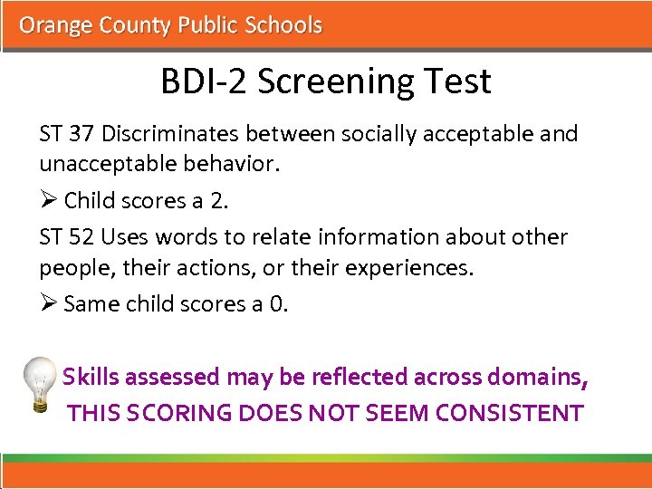 BDI-2 Screening Test ST 37 Discriminates between socially acceptable and unacceptable behavior. Ø Child scores a 2. ST 52 Uses words to relate information about other people, their actions, or their experiences. Ø Same child scores a 0. Skills assessed may be reflected across domains, THIS SCORING DOES NOT SEEM CONSISTENT