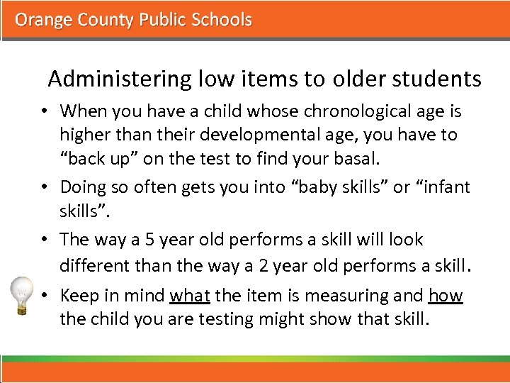 Administering low items to older students • When you have a child whose chronological age is higher than their developmental age, you have to “back up” on the test to find your basal. • Doing so often gets you into “baby skills” or “infant skills”. • The way a 5 year old performs a skill will look different than the way a 2 year old performs a skill. • Keep in mind what the item is measuring and how the child you are testing might show that skill.