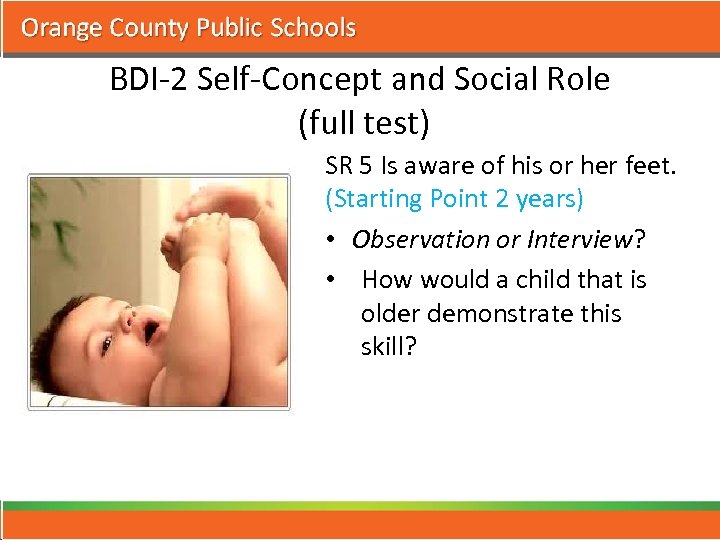 BDI-2 Self-Concept and Social Role (full test) SR 5 Is aware of his or her feet. (Starting Point 2 years) • Observation or Interview? • How would a child that is older demonstrate this skill?