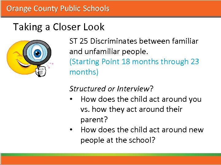 Taking a Closer Look ST 25 Discriminates between familiar and unfamiliar people. (Starting Point 18 months through 23 months) Structured or Interview? • How does the child act around you vs. how they act around their parent? • How does the child act around new people at the school?