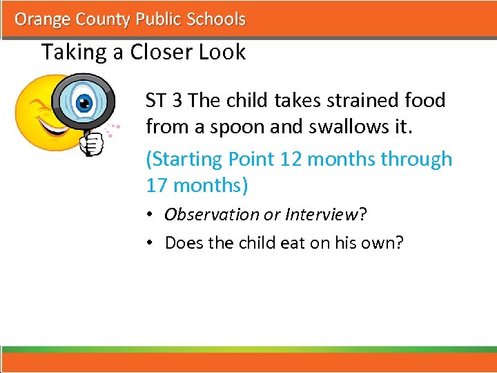 Taking a Closer Look ST 3 The child takes strained food from a spoon and swallows it. (Starting Point 12 months through 17 months) • Observation or Interview? • Does the child eat on his own?