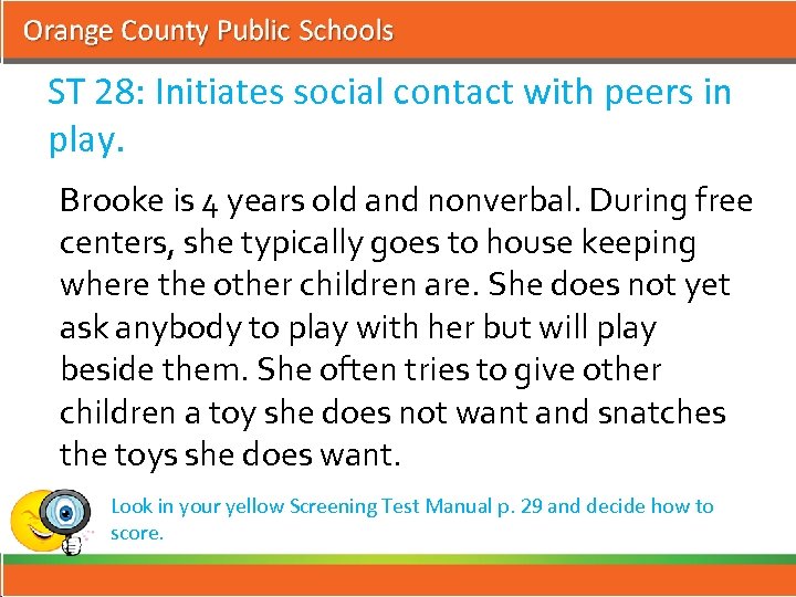 ST 28: Initiates social contact with peers in play. Brooke is 4 years old and nonverbal. During free centers, she typically goes to house keeping where the other children are. She does not yet ask anybody to play with her but will play beside them. She often tries to give other children a toy she does not want and snatches the toys she does want. Look in your yellow Screening Test Manual p. 29 and decide how to score.