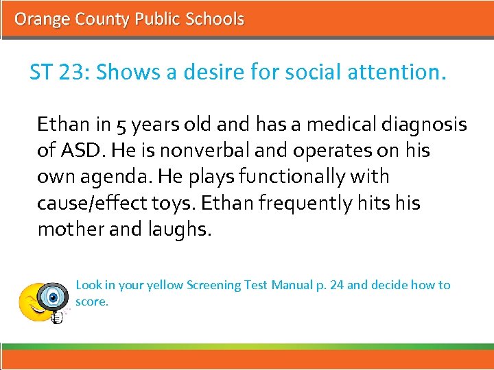 ST 23: Shows a desire for social attention. Ethan in 5 years old and has a medical diagnosis of ASD. He is nonverbal and operates on his own agenda. He plays functionally with cause/effect toys. Ethan frequently hits his mother and laughs. Look in your yellow Screening Test Manual p. 24 and decide how to score.