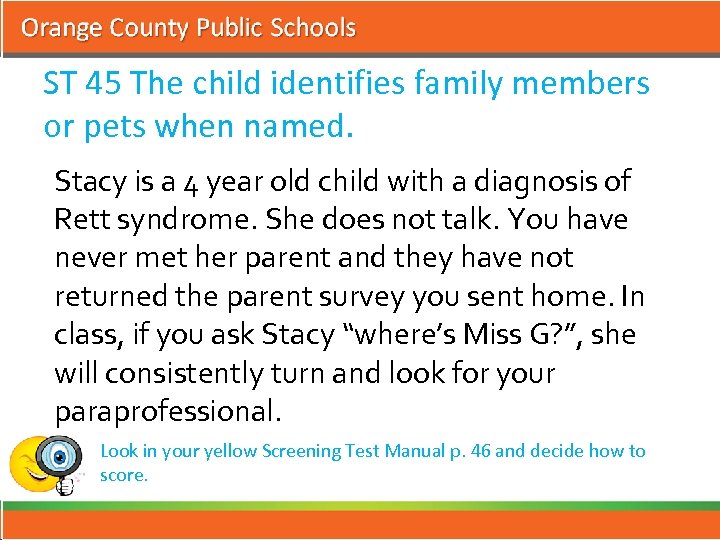 ST 45 The child identifies family members or pets when named. Stacy is a 4 year old child with a diagnosis of Rett syndrome. She does not talk. You have never met her parent and they have not returned the parent survey you sent home. In class, if you ask Stacy “where’s Miss G? ”, she will consistently turn and look for your paraprofessional. Look in your yellow Screening Test Manual p. 46 and decide how to score.