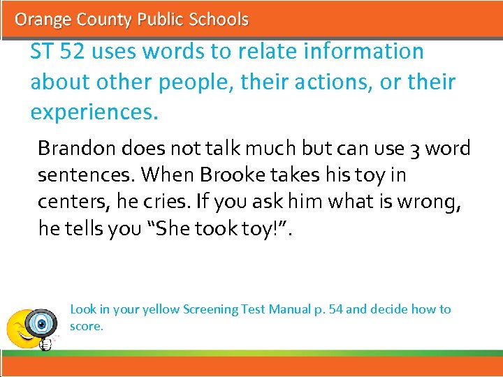 ST 52 uses words to relate information about other people, their actions, or their experiences. Brandon does not talk much but can use 3 word sentences. When Brooke takes his toy in centers, he cries. If you ask him what is wrong, he tells you “She took toy!”. Look in your yellow Screening Test Manual p. 54 and decide how to score.