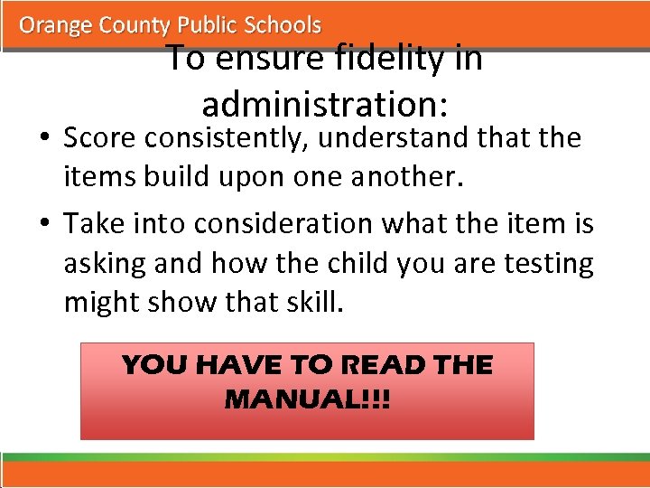 To ensure fidelity in administration: • Score consistently, understand that the items build upon one another. • Take into consideration what the item is asking and how the child you are testing might show that skill. YOU HAVE TO READ THE MANUAL!!!