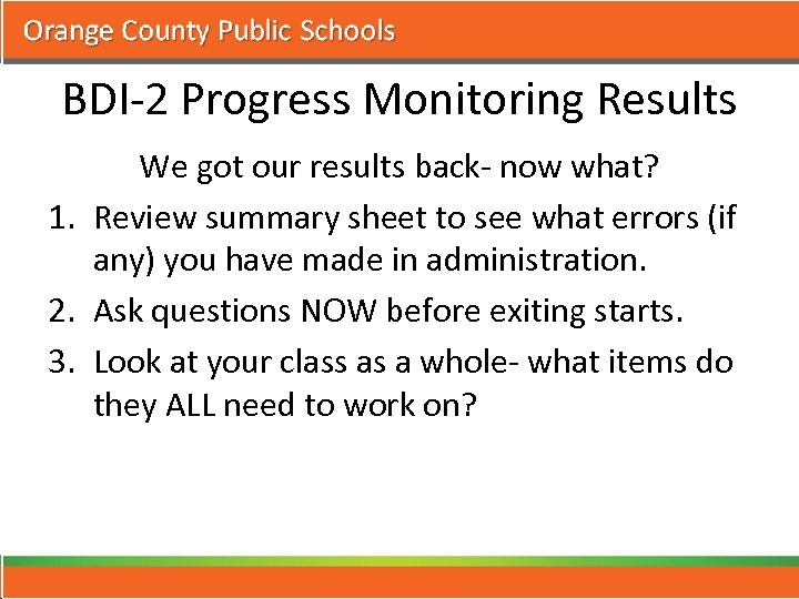 BDI-2 Progress Monitoring Results We got our results back- now what? 1. Review summary sheet to see what errors (if any) you have made in administration. 2. Ask questions NOW before exiting starts. 3. Look at your class as a whole- what items do they ALL need to work on?