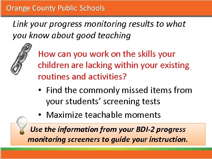 Link your progress monitoring results to what you know about good teaching How can you work on the skills your children are lacking within your existing routines and activities? • Find the commonly missed items from your students’ screening tests • Maximize teachable moments Use the information from your BDI-2 progress monitoring screeners to guide your instruction.